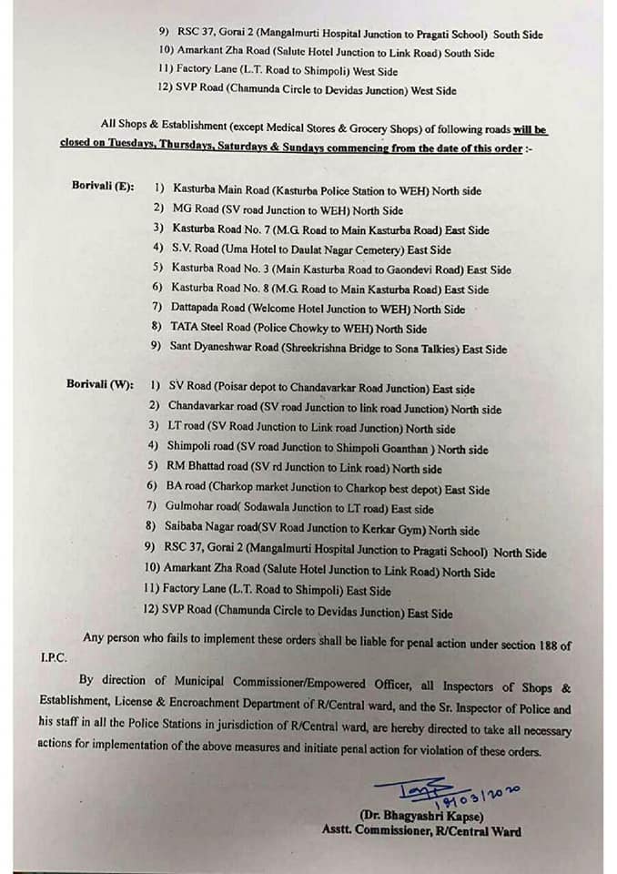 Novel #Coronavirus has been recently declared as a pandemic by the WHO. Due to this, the Assistant Commissioner of R/Central Ward, Dr. Bhagyashri Kapse has taken measures to control the crowd by means of social distancing. All shops (except medical stores and grocery shops) in Borivali East and West will remain closed on Mondays, Wednesdays, Fridays, and Sundays commencing from today. Find information about your area in the image above!