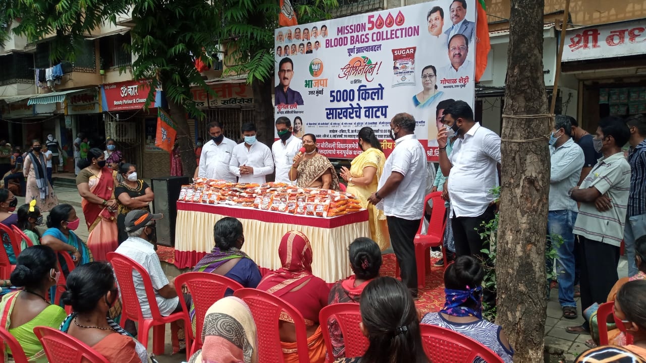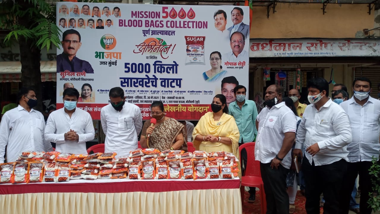 On the successful completion of collecting 5000 blood bags, a vision initiated by MP Gopal Shetty, As a gesture of gratitude 5000 kg sugar distribution is carried out under in various locations in Borivali Constituency for all my fellow citizens who helpe
