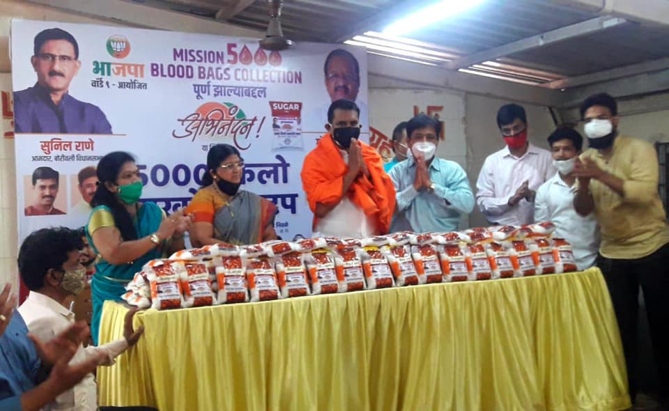 On the successful completion of collecting 5000 blood bags, a vision initiated by MP Gopal Shetty, As a gesture of gratitude 5000 Sugar kg distribution is carried out under in various locations in Borivali Constituency for all my fellow citizens who helpe