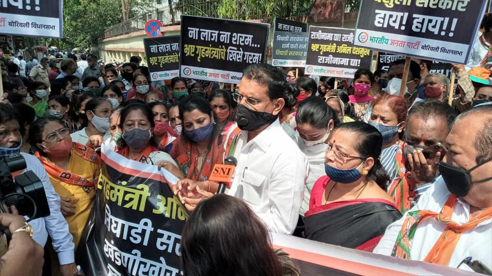Participated in an agitation organised by BJP Borivali constituency at Borivali Police Station (West). Demanded immediate resignation of Shri Anil Deshmukh, Home Minister of Maharashtra, over serious allegations against him. Corporators Mrs. Asawari Patil, Mrs. Bina Doshi, Mr. Pravin Shah, Mr Vidyarthi Singh, Mahila Morcha President Mrs. Reshma Nivle, ex corporator Mr. Shiva Shetty were also present.