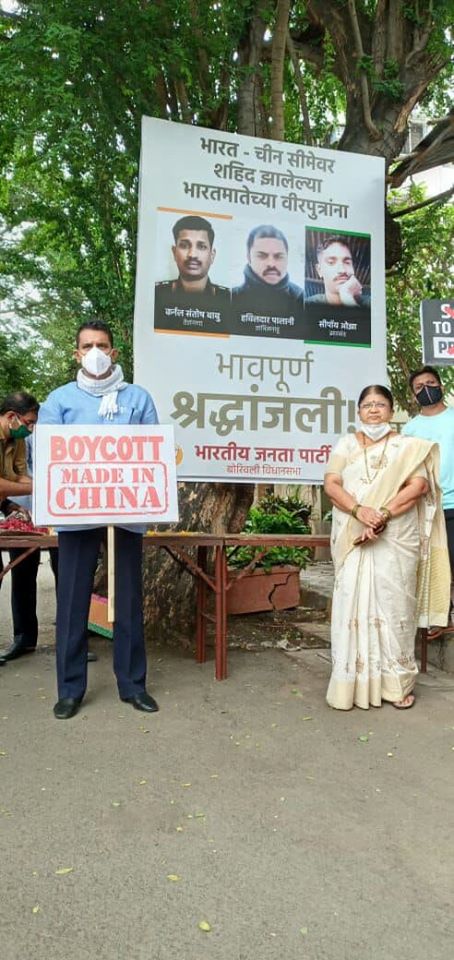Shri. Sunil Rane paid tributes to the soldiers who were martyred in the clashes on the Indo-China border. Also pledged that we would no longer use Chinese goods. BJP Borivali Mandal post holders, corporators, ward presidents etc. were present outside BJP Borivali Office today.