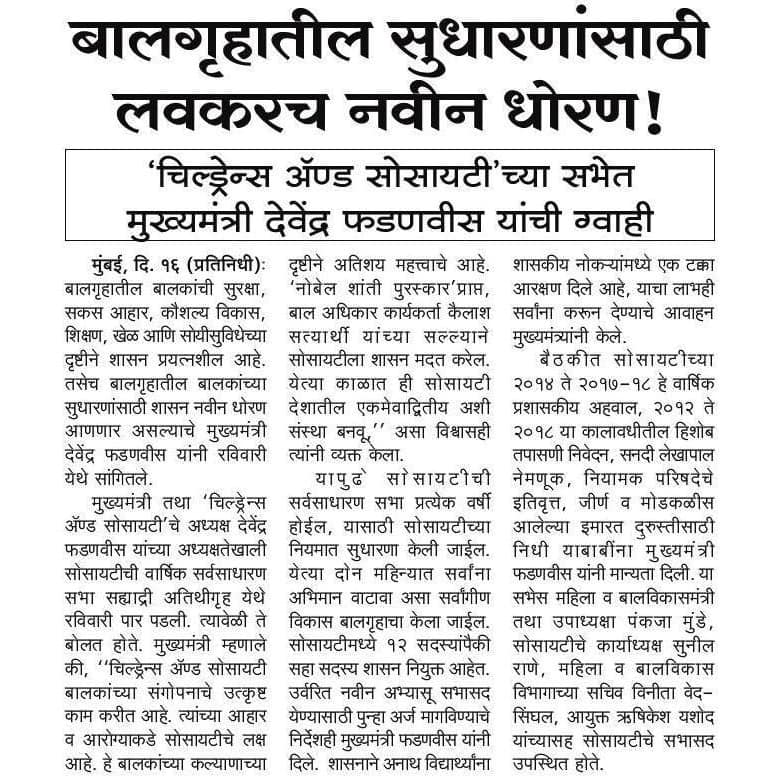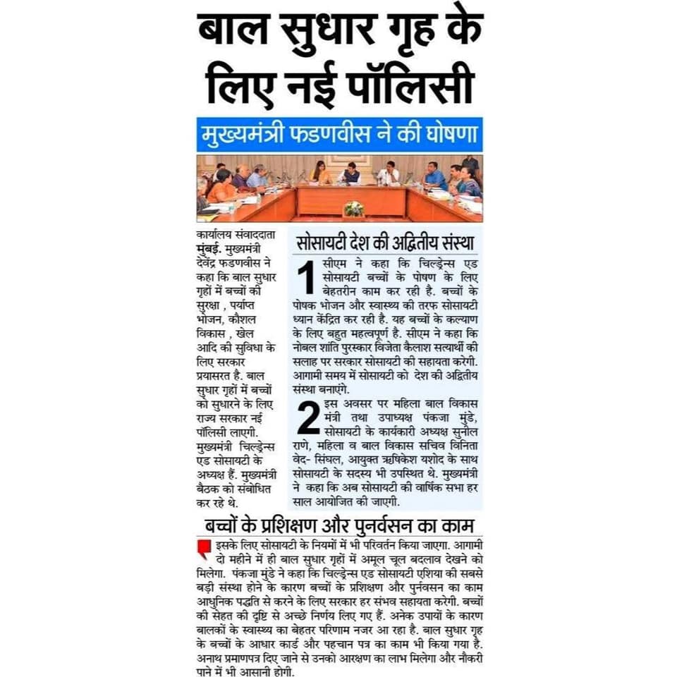 Excellent meeting conducted by Hon C.M.of Maharashtra & President of Children's Aid Society with Hon. Minister for Women & Child Welfare Smt. Pankaja Munde for the children's welfare & education. Jai Hind!!!