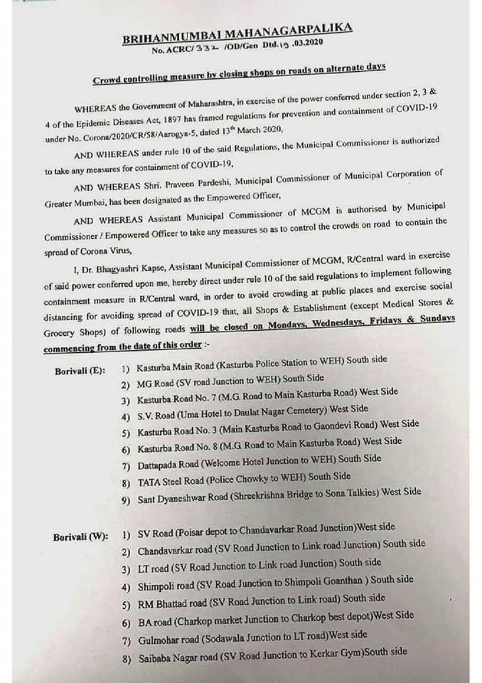 Novel #Coronavirus has been recently declared as a pandemic by the WHO. Due to this, the Assistant Commissioner of R/Central Ward, Dr. Bhagyashri Kapse has taken measures to control the crowd by means of social distancing. All shops (except medical stores and grocery shops) in Borivali East and West will remain closed on Mondays, Wednesdays, Fridays, and Sundays commencing from today. Find information about your area in the image above!